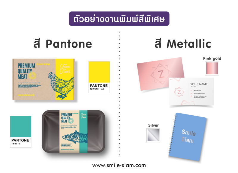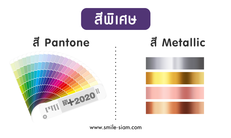 สี Metallic เช่น สีทอง สีเงิน สีทองแดง สะท้อนแสง สีเมทัลลิค เป็นต้น เพราะเป็นสีที่พิมพ์ออกมาให้ตรงกับหน้าจอค่อนข้างยาก แต่การใช้สีพิเศษช่วยในการพิมพ์นั้น ทำให้งานพิมพ์ออกมาใกล้เคียงกับ Artwork