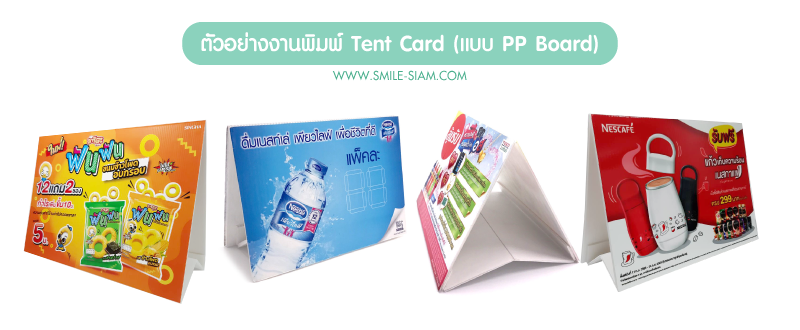 PP Board เป็นวัสดุที่ทำมาจากพลาสติก ค่อนข้างแข็งแรงทนทาน สามารถใช้งานได้หลากหลาย เหมาะสำหรับการวางทั้งภายใน (Indoor) และภายนอกอาคาร Outdoor  เราจะพบเห็นได้บ่อยตามปั๊มน้ำมัน โดย Tent Card  จะถูกวางลงบนกองของแถมอย่างน้ำดื่ม เป็นต้น รูปแบบงานพิมพ์ PP Board Tent Card นั้นมี 2 แบบคือ การพิมพ์โดยตรง (Direct) ลงวัสดุ PP Board และการพิมพ์ลง Sticker ชนิดต่าง ๆ แล้วปะลง PP Board