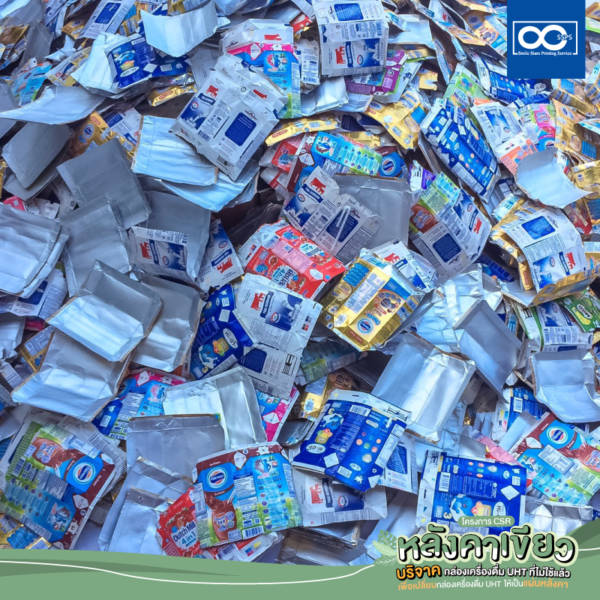 เพื่อรีไซเคิลเป็นแผ่นหลังคาเพื่อนำไปบริจาคกับมูลนิธิอาสาเพื่อนพึ่ง (ภาฯ) ยามยากสภากาชาดไทย