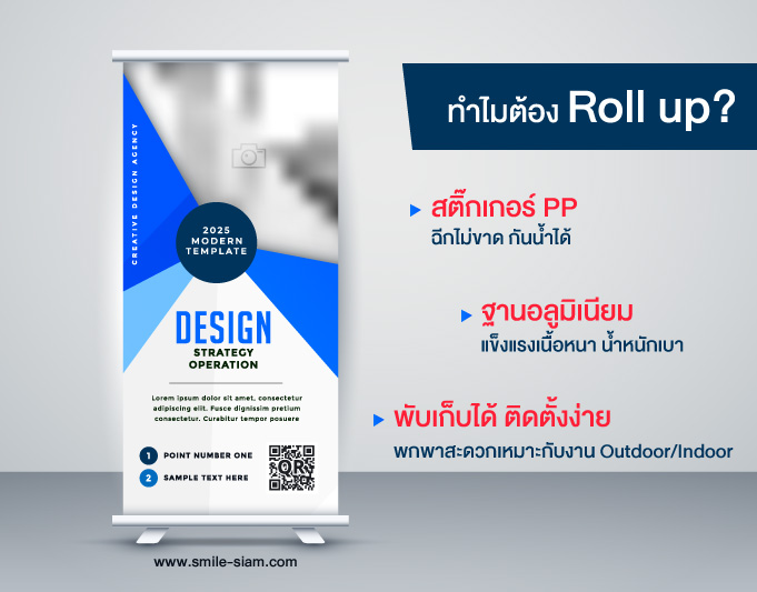 Roll up หรือ โรลอัพ สื่อส่งเสริมการขายยอดฮิตที่ได้รับความนิยมเป็นอย่างมาก เหมาะสำหรับการใช้งานเพื่อดึงดูดความสนใจจากลูกค้า นิยมใช้เป็นอุปกรณ์ในการออกบูธ เป็นป้ายตั้งหน้าร้าน โดย Roll up จะแสดงข้อมูลของสินค้า หรือโปรโมชั่นได้อย่างชัดเจน หลาย ๆ ธุรกิจ หรือแบรนด์ จะใช้ Roll up ในการประชาสัมพันธ์สินค้าและบริการ เนื่องจาก Roll up เป็นอุปกรณ์ที่สามารถพับเก็บ ติดตั้ง และเคลื่อนย้ายได้สะดวก มีน้ำหนักเบา ใช้งานง่าย
