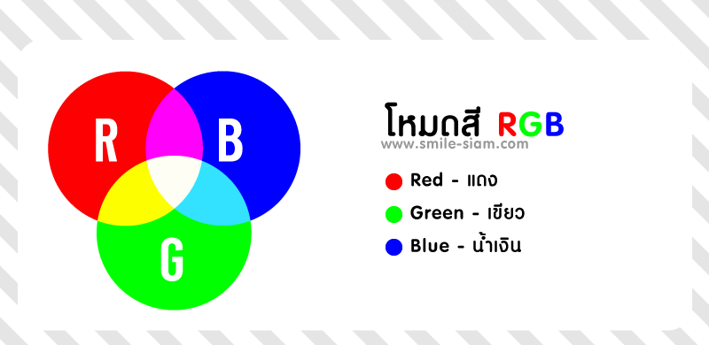 RGB คือชุดสีที่เกิดจากแสงที่มีความยาวคลื่นที่ต่างกันมารวมตัวกันเกิดเป็นสีต่างๆ เรียกว่า “การผสมสีแบบบวก” (Additive Color) เมื่อเรานำแม่สี RGB แต่ละสีในปริมาณที่เท่ากันมาผสมกันจะได้สีขาว แต่หากผสมกันในปริมาณที่ต่างกัน เราจะได้สีที่หลากหลายเป็นล้าน ๆ สี เหมือนที่เราเห็นสีต่าง ๆ ในสื่อดิจิทัล
