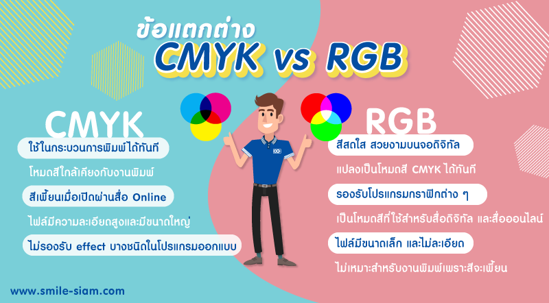 - ไฟล์โหมดสี CMYK จะมีขนาดใหญ่กว่า ไฟล์โหมดสี RGB