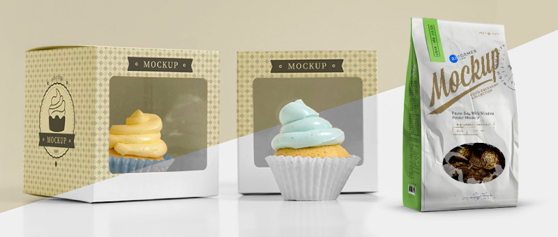 ตัวอย่าง : กล่องใส่เค้กดีไซน์ด้วยสีโทน Pastel และมีการใช้เทคนิคการเจาะหน้าต่างพร้อมติดแผ่นใส เพื่อโชว์คัฟเค้กที่รสชาติแตกต่างกันไป เช่นกันเดียวกับซองบรรจุป๊อปคอร์นที่ใช้เทคนิคเดียวกันเพื่อโชว์ป๊อปคอร์นที่อยู่ด้านใน เพราะมีหลายรสชาติให้ลูกค้าเลือก