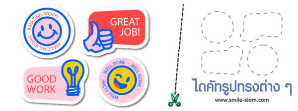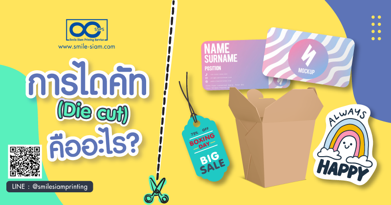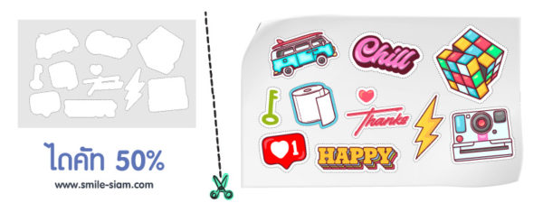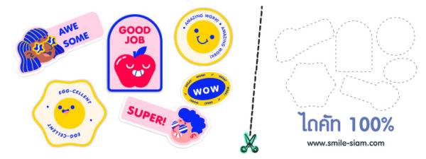 - การไดคัทรูปทรงต่างๆ : คือการไดคัทตามรูปร่างของ Artwork ที่ออกแบบไว้ ซึ่งเป็นลักษณะเฉพาะเช่น วงกลม วงรี สามเหลี่ยม รูปการ์ตูน รูปดอกไม้ และรูปทรงอื่น ๆ เป็นต้น