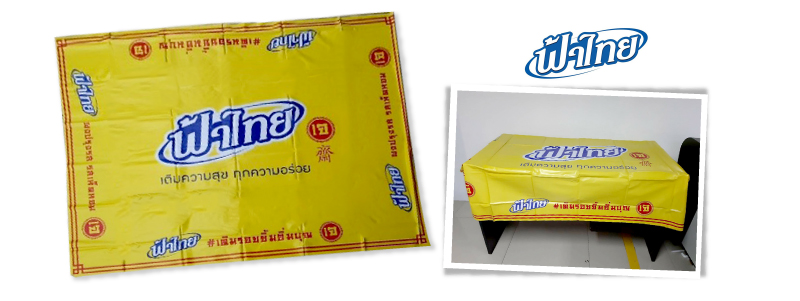 2. ใส่สโลแกน หรือเน้นแจกตามเทศกาลได้เพื่อให้ลูกค้าเห็นแล้วจดจำคนที่ไม่เคยใช้ก็อยากลองซื้อมาใช้ อย่างผ้าปูโต๊ะของแบรนด์ฟ้าไทย ที่เลือกใส่สโลแกน “เติมความสุข ทุกความอร่อย”
