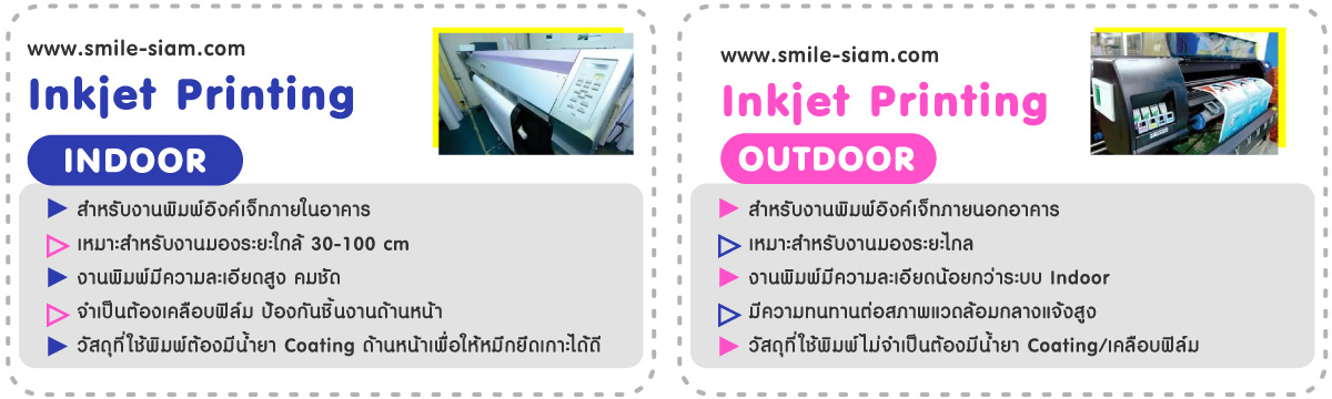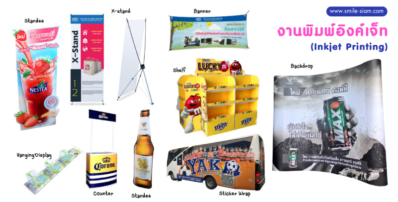 โรงพิมพ์ สไมล์ สยาม พริ้นติ้ง เซอร์วิส มีบริการงานพิมพ์อิงค์เจ็ท (Inkjet) ทุกประเภท ทั้งงาน Indoor หรือ Outdoor เรามีเครื่องพิมพ์อิงค์เจ็ทประสิทธิภาพสูง เครื่องไดคัท เครื่องเคลือบ ฯลฯ และยังรองรับงานตามแบบของลูกค้าได้ทุกความต้องการ ไม่ว่าจะเป็นงานไดคัท PP board ตามรูปแบบต่าง ๆ หรืองาน ติดตั้งงานพิมพ์อิงค์เจ็ท (Inkjet) ตามสถานที่ต่าง ๆ อีกด้วย นอกจากนี้ยังมีแผนก Order processing & Quality control (OP & QC) เป็นแผนกวางแผนงานผลิต ควบคุมคุณภาพ และตรวจสอบคุณภาพของสินค้าทุกชิ้นก่อนถึงมือลูกค้า ด้วยการรับรองมาตรฐานโดยระบบควบคุมคุณภาพ ISO9001:2015