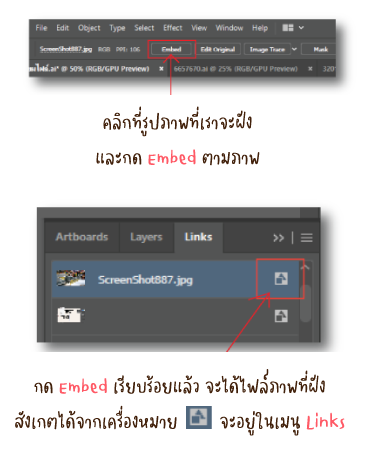 คลิกที่ภาพที่เราจะทำการฝังไฟล์ > และคลิกที่คำว่า Embed จะอยู่ในแถบ Control Panel ตามรูปด้านล่างค่ะ สามารถทำได้แค่เพียงโปรแกรมเดียวเท่านั้น ก็คือ Illustrator (.ai)