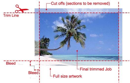 ตัดตก = Bleed ค่ะ คือระยะการเผื่อจากรูปภาพ หรือข้อความในการตัดกระดาษ เช่นถ้าเราทำงานพิมพ์ใบปลิว แล้วเราวางรูปอาหารไว้ซ้ายสุดตกขอบเลย เวลาที่โรงพิมพ์ตัดงานด้วยเครื่องตัด รูปภาพนั้นจะถูกตัดหายไป 0.3 mm นะคะ อันนี้ต้องระวังมาก ๆ โดยเฉพาะเวลาที่เราไปจ้างกราฟฟิคออกแบบมา เค้าส่งไฟลมาให้จ่ายตังแล้วด้วย พอเรามาสั่งงานพิมพ์ โรงพิมพ์บอกให้แก้เพราะไฟลไม่มีเผื่อตัดตกมา จะทำให้งานเราถูกตัดขาดไป เอาจริงๆ ในบางกรณีโรงพิพม์ก็แก้ให้ได้นะคะ แต่ในบางทีที่ส่งไฟล PDF หรือทำมาใน Canvas มา จะแก้ให้ไม่ได้เลยค่ะ อันนี้สำคัญ