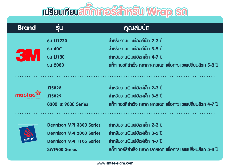 งานพิมพ์บน Sticker ที่ติดเป็นสื่อโฆษณาบนรถ เช่น Food Truck, รถขนส่งสินค้า, รถเมล์ หรือแม้แต่ BTS ที่เราเห็นภายนอกตัวรถ เป็นงาน Inkjet Outdoor ค่ะ ลูกค้าสามารถเลือกเกรด Sticker ได้จากตารางนี้นะคะ