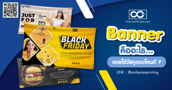 แบนเนอร์ คือสื่อโฆษณาที่เราเห็นบ่อย ๆ ตามหน้าร้าน วัสดุที่ใช้นำมาพิมพ์คือ ไวนิลทึบแสง มีความหนาตั้งแต่ 0.35 mm, 0.40 mm ค่ะ ขนาดที่นิยมคือ 1*3 เมตรนะคะ ปล่อยชายเชือกข้างละ 1 เมตรเพื่อเอาไว้แขวน งานพิมพ์แบนเนอร์ต้องใช้หมึก Outdoor เพราะต้องตากแดด ตากลม และโดนฝนทั้งวันได้ค่ะ หากต้องการติดนานๆเกิน 3 ปีขึ้นไป หรือในบริเวณที่ลมแรงมากๆ แนะนำความหนาที่ 0.40 mm นะคะ