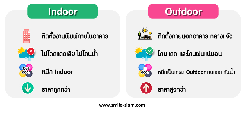แต่ไม่ใช่ว่าจะมีกันทุกโรงพิมพ์นะคะ อันนี้ต้องสอบถามให้ดีก่อน เพราะทั้งระบบการพิมพ์และหมึกที่ใช้ก็เป็นคนละแบบกับงานพิมพ์ออฟเซทธรรมดา หากลูกค้าสั่งไปว่าใช้งาน Outdoor แล้ว พอใช้ไปซักพักสีซีด แสดงว่า เค้าไม่ได้ใช้เครื่องพิพม์และหมึก Outdoor แน่นอนค่ะ ลูกค้าสามารถโทรมาสอบถามกับทีมขายเราก่อนได้นะคะ ว่างานแบบไหนควรเลือกใช้หมึกแบบไหน เรายินดีให้คำแนะนำค่ะ